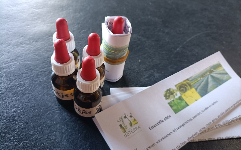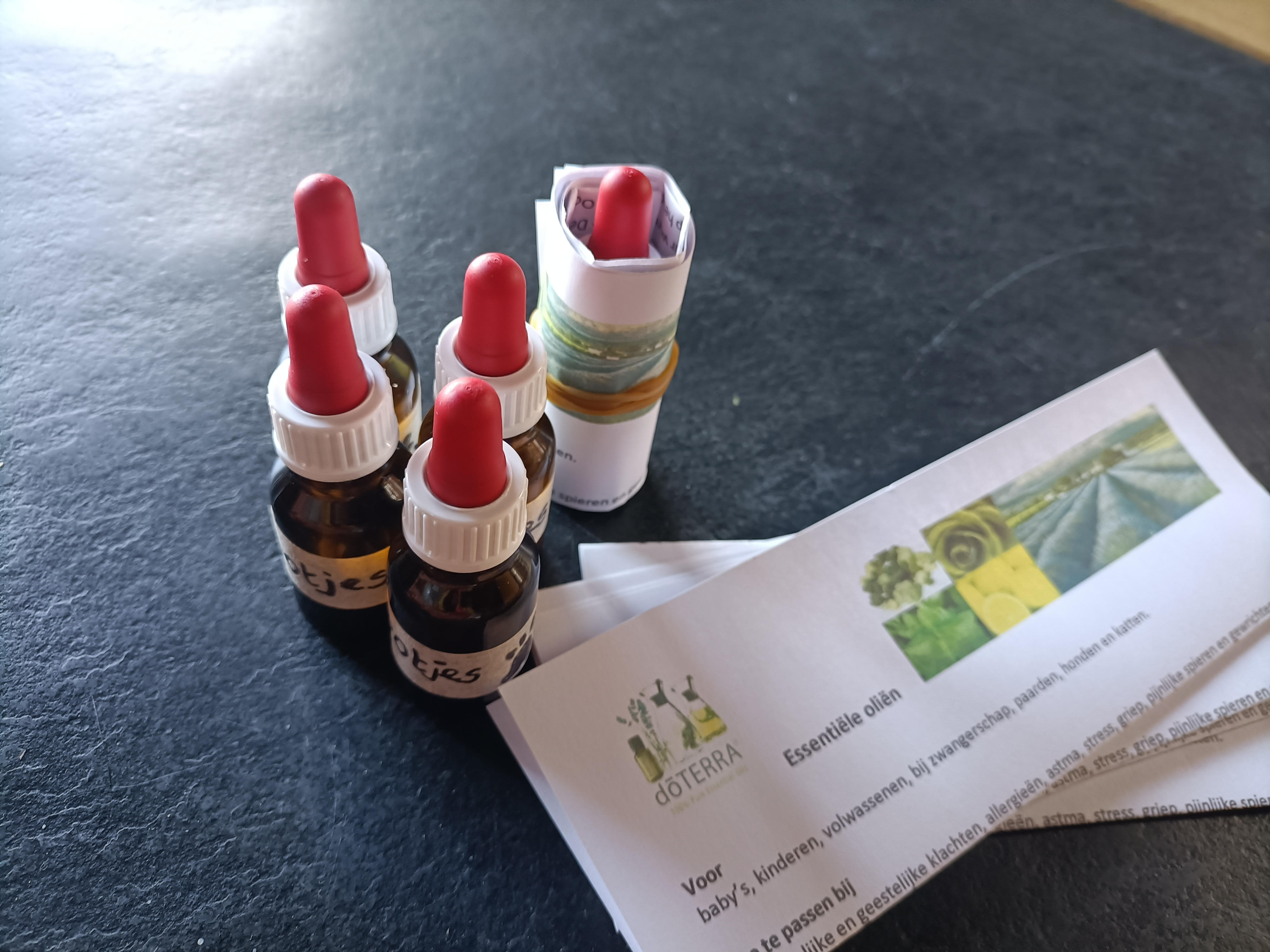 In het flesje zitten 5 oliën. Een flesje kan jarenlang mee. Gebruik is veilig bij dieren. Stressvrij te geven uiteraard. Puur natuur. Met uitelg.